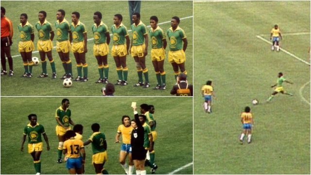 وعرفت زائير مغامرة واحدة في كأس العالم، كانت في عام 1974، حينها ظهرت لقطة تاريخية في مباراتها أمام البرازيل المتسلحة بنجوم مثل ريفيلينو وجارزينيو، فبعد أن كان اللاعبان يتأهبان لكيفية تسديد ركلة حرة، خرج المدافع مويبو إيلونجا بشكل مفاجئ من الحائط البشري وركل الكرة بعيداً في حركة كوميدية لكن في الحقيقة كانوا يواجهون تهديداً من الرئيس الدكتاتور موبوتو.