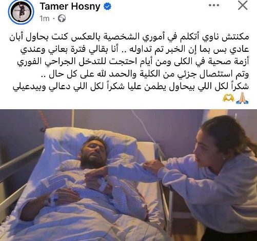 مشيرا إلى أن الفريق الطبي المعالج سمح لتامر حسني بقضاء فترة النقاهة في منزله، وطلب منه الخضوع لفحوصات وتحاليل إضافية خلال الفترة القادمة للاطمئنان الكامل على حالته الصحية ومتابعة نتائج الجراحة.