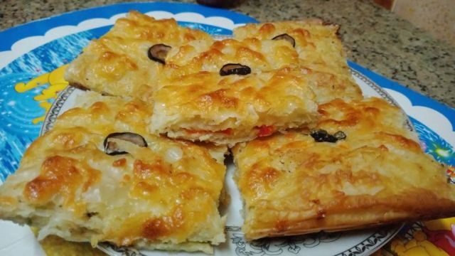 نحضر صينية ويتم دهنها بالزيت ويفرد بها أوراق الجلاش مع دهن بين الورق بخليط من الزبدة والزيت.