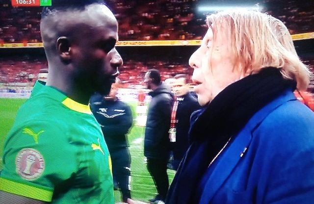 التقطت الكاميرات كلود لوروا وهو يتحدث مع نجم السنغال، ساديو ماني، في محاولة لإقناعه بالعودة لإكمال المباراة رغم شعور الفريق بالظلم.