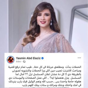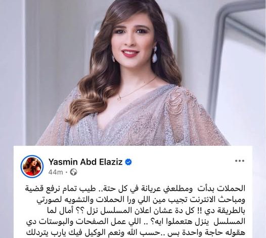 أبدت الفنانة ياسمين عبد العزيز استيائها الشديد، من الحملات الإلكترونية التي تستهدفها خلال الفترة الحالية تزامنا مع إعلان مسلسلها الجديد “وننسى اللي كان” المقرر عرضه رمضان 2026.
