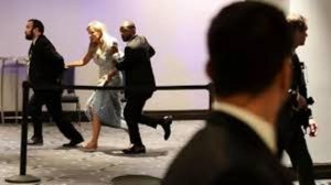 واحتمى مئات الضيوف أسفل الطاولات بينما اندفع أفراد الخدمة السرية بزيهم القتالي إلى قاعة الطعام.