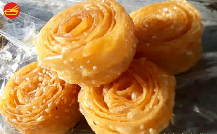 4- يسخن الزيت في مقلاة عميقة ،يمسك طرف شريط العجينة بالشوكة والطرف الثاني باليد وتسند في قاع المقلاة ، تلف العجينة على بعضها إلى أن تتماسك وتتشكل لدينا لفافة مفتوحة قليلاً مثل الوردة ، تبعد الشوكة وتترك الوردة إلى أن تتماسك قليلاً.