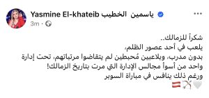 ياسمين الخطيب : شكرا للاعبي الزمالك .. بينافسوا رغم الظروف وأسوأ إدارة في تاريخ النادي
